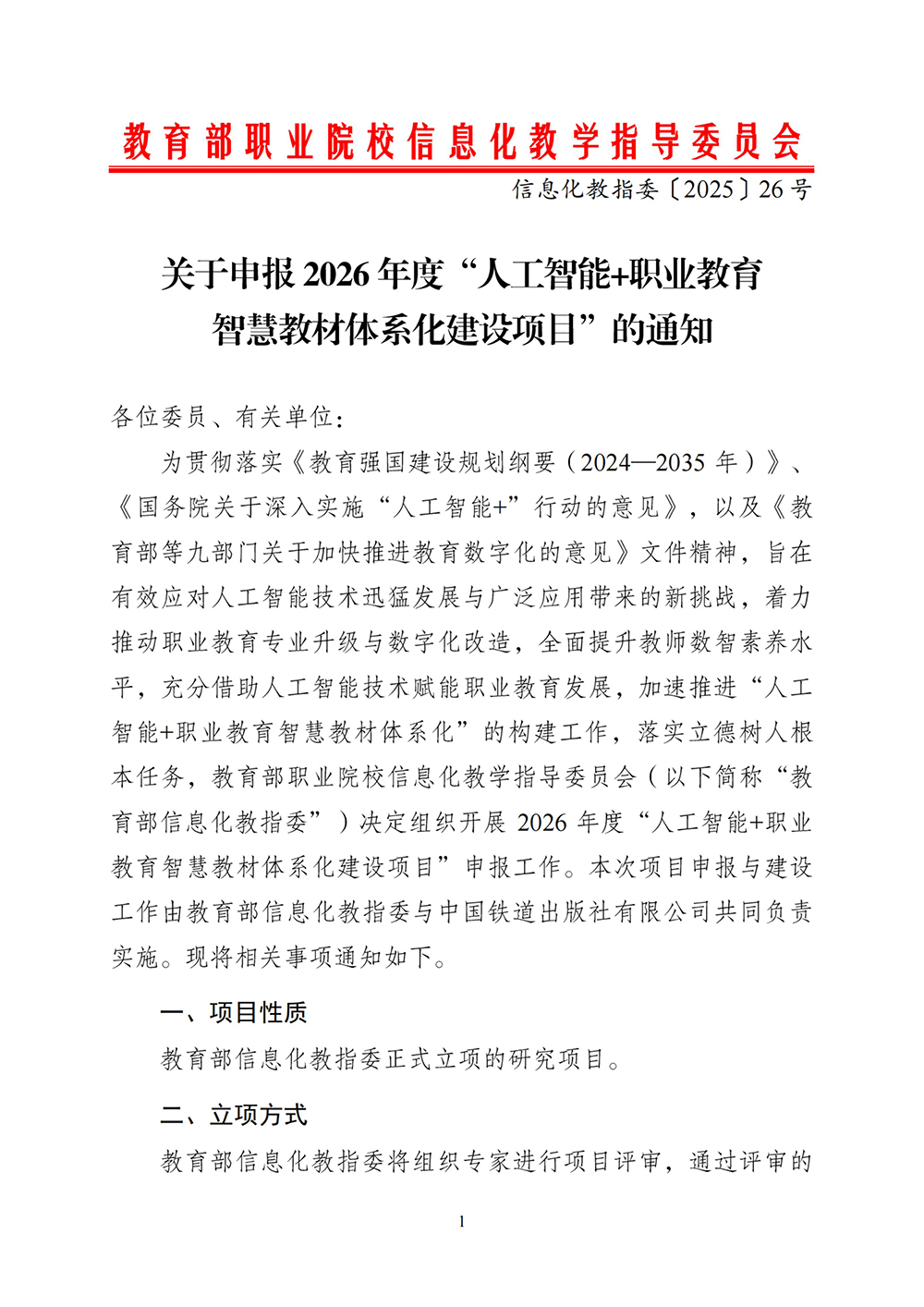 关于申报2026年度“人工智能+职业教育智慧教材体系化建设项目”的通知
