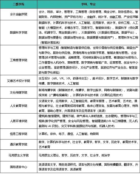 目前共有20000余名在校生,学校下设会计金融学院、数据科学学院、工商管理学院、文化传媒学院、人文教育学院、艾德艺术设计学院、信息工程学院、人居环境学院、职业教育学院、通识教育学院、马克思主义学院、国际语言中心等12个教学机构。