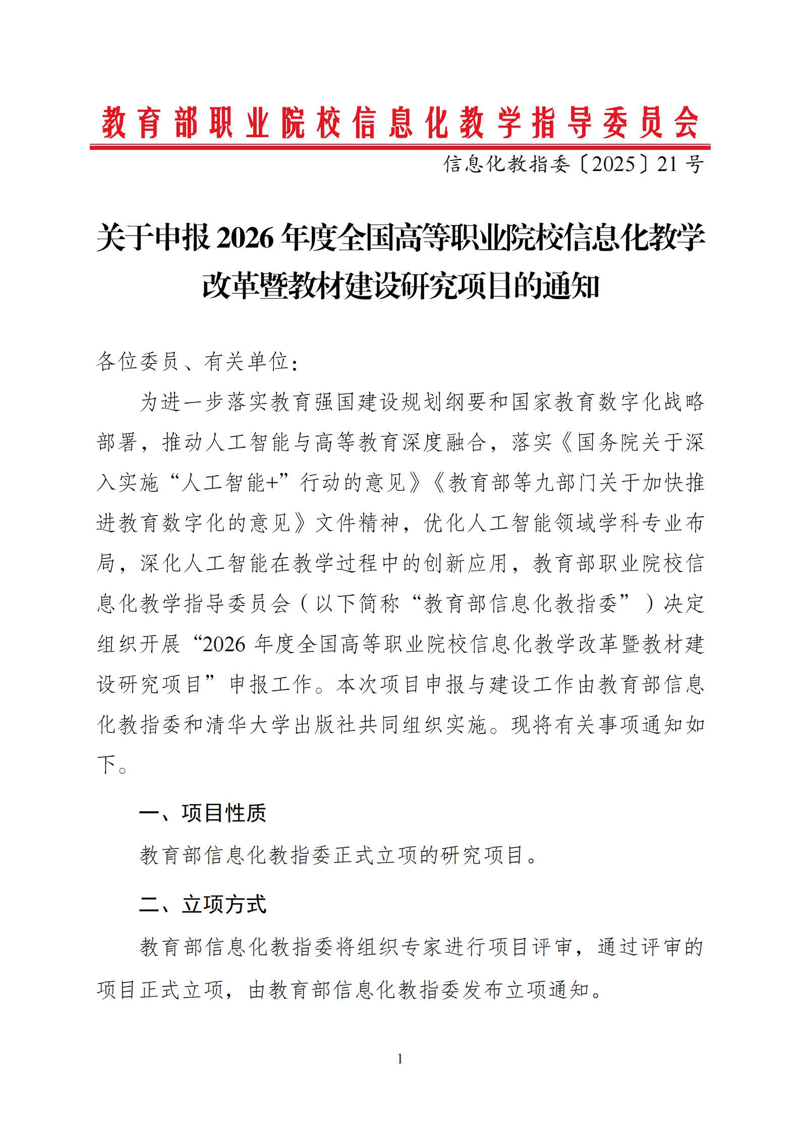 教育部职业院校信息化教学指导委员会关于申报2026年度全国高等职业院校信息化教学改革暨教材建设研究项目的通知