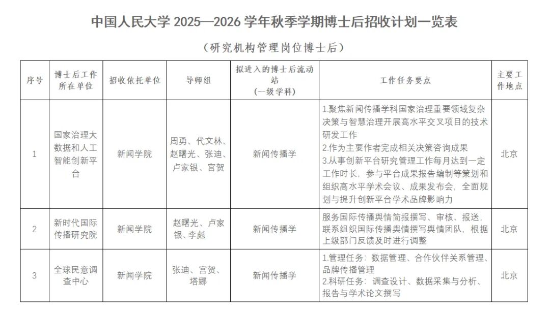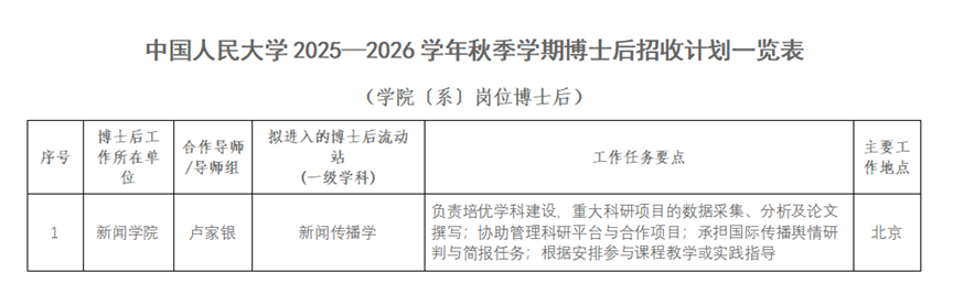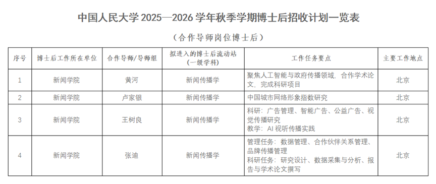 中国人民大学新闻学院2025-2026学年秋季学期博士后招聘公告