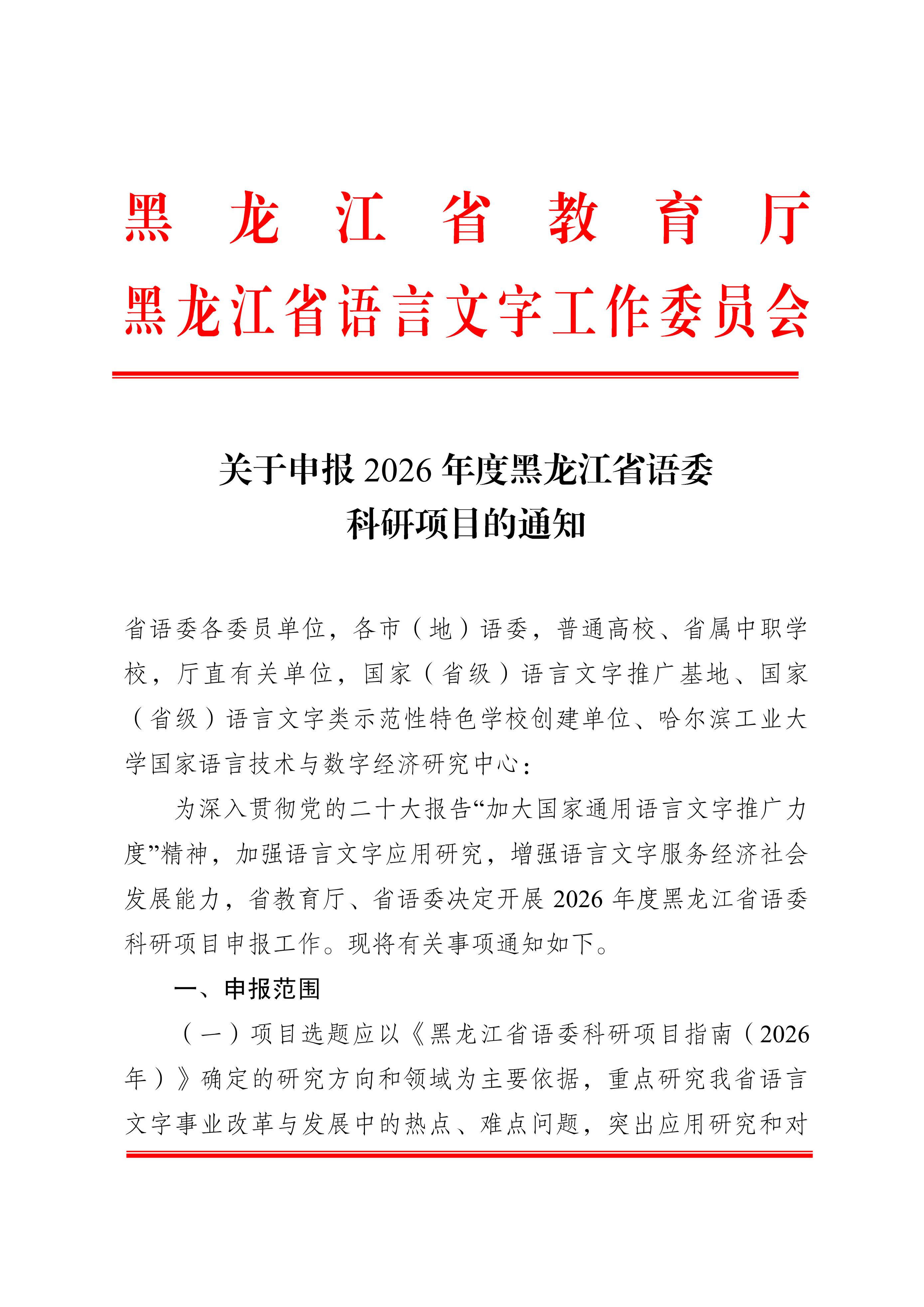 关于申报2026年度黑龙江省语委科研项目的通知