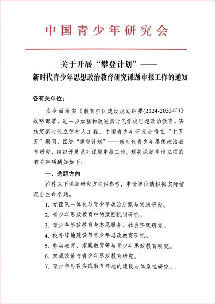 关于开展“攀登计划”——新时代青少年思想政治教育研究课题申报工作的通知