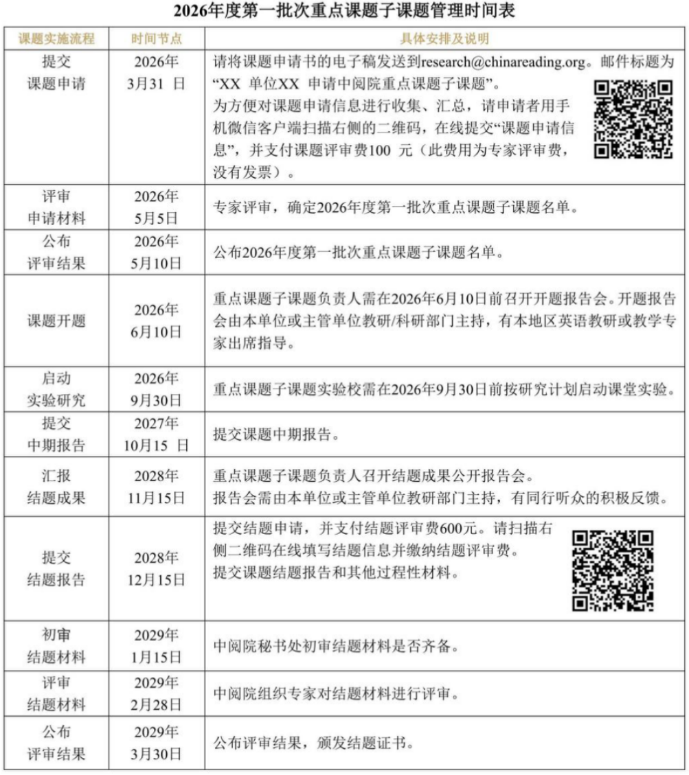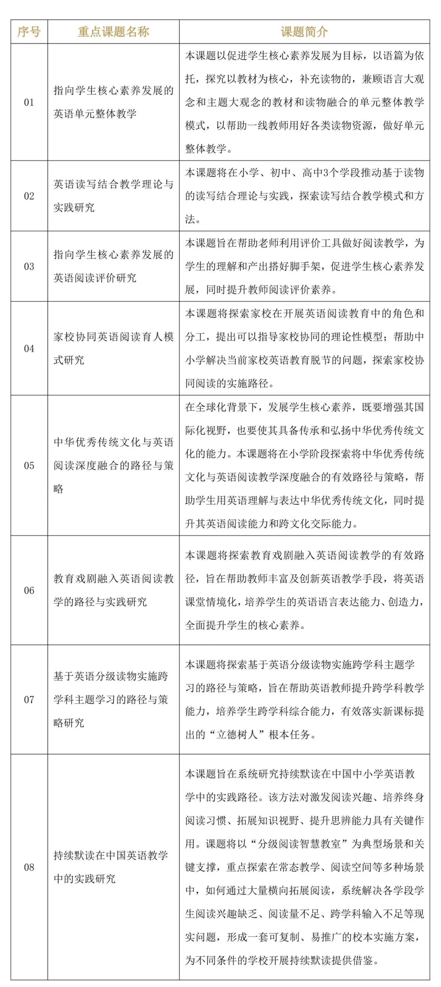 为深入贯彻全民阅读战略,落实立德树人根本任务,中国英语阅读教育研究院现启动2026年度重点课题子课题申报工作。本次申报依托中阅院已设立的八项重点课题,面向全国中小学、高校外语教师及教研机构研究人员开放子课题申报。