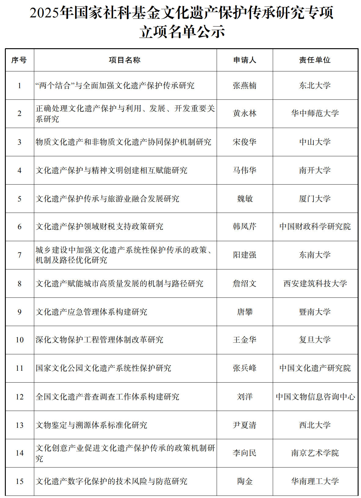 2025年国家社科基金文化遗产保护传承研究专项立项名单公示