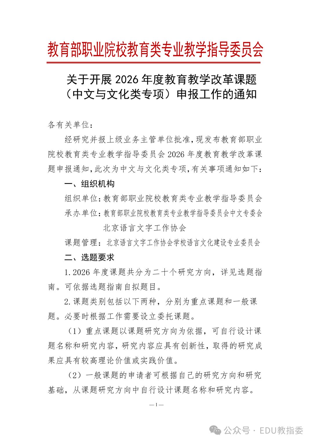 关于开展2026年度教育教学改革课题(中文与文化类专项)申报工作的通知