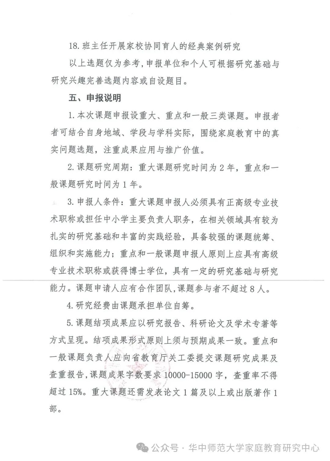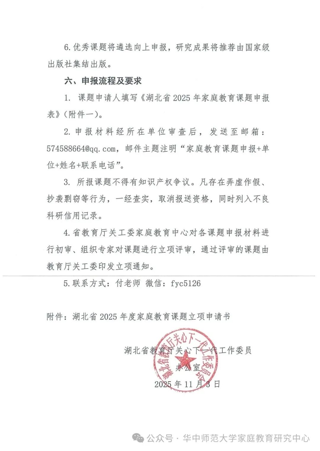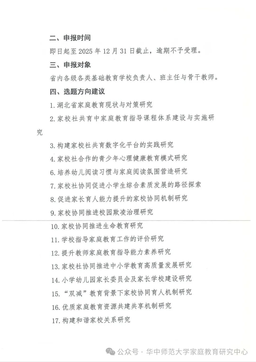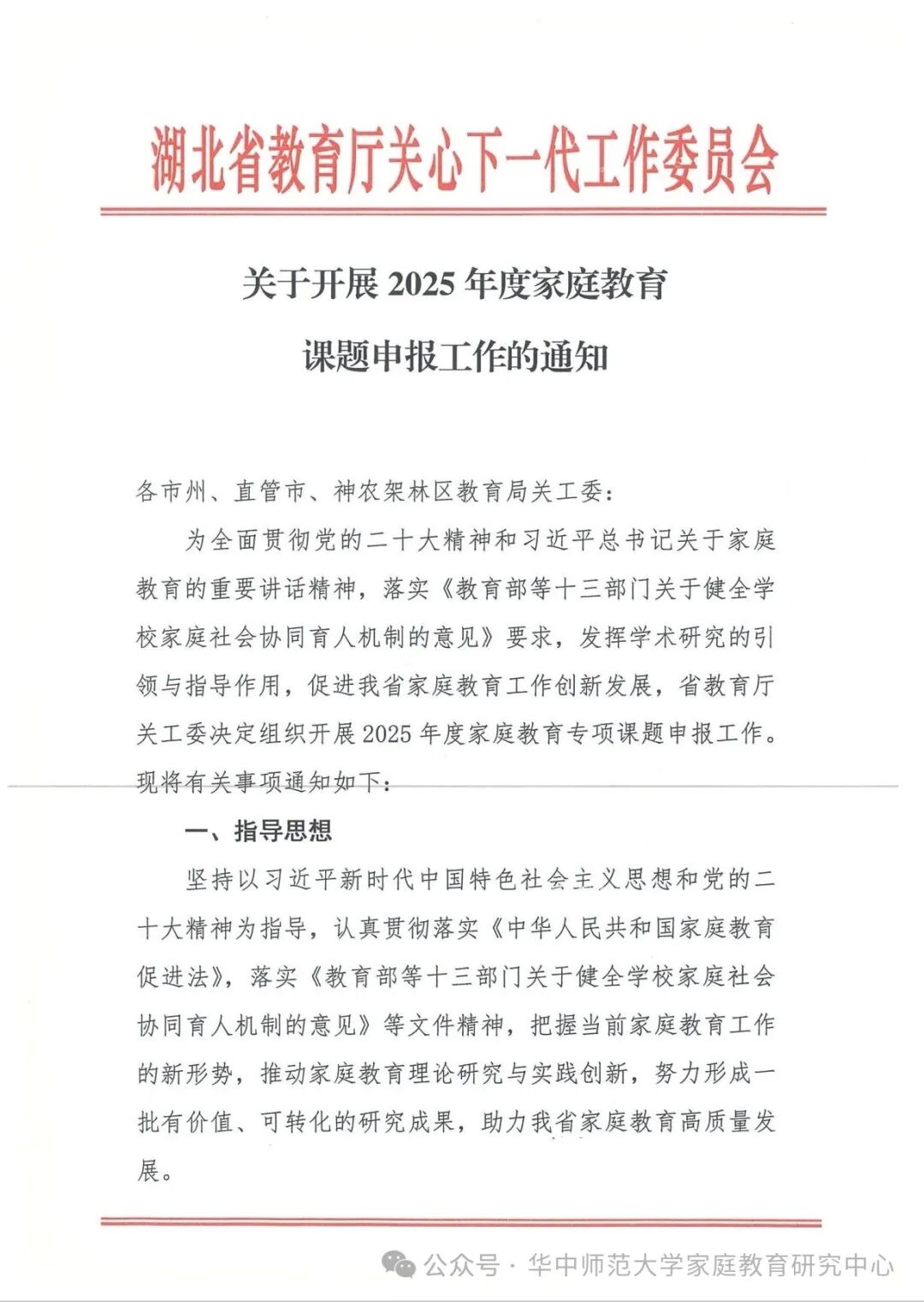 为全面贯彻党的二十大精神和习近平总书记关于家庭教育的重要讲话精神,落实《教育部等十三部门关于健全学校家庭社会协同育人机制的意见》要求,发挥学术研究的引领与指导作用,促进我省家庭教育工作创新发展,省教育厅关工委决定组织开展2025年度家庭教育专项课题申报工作。现将有关事项通知如下: